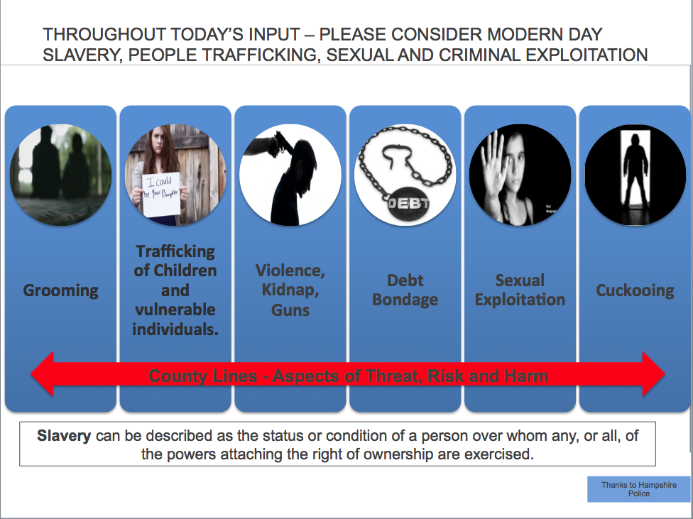 It is the name given to the trafficking and exploitation of young people and vulnerable adults within the UK, for criminal purposes. You may have seen mention of this over the last weeks in many newspapers, and the corresponding guidance to combat this has been prepared by the National Crime Agency and supported by the Home Office, Ending Youth and Gang Violence and Exploitation forum, of which I am a member.